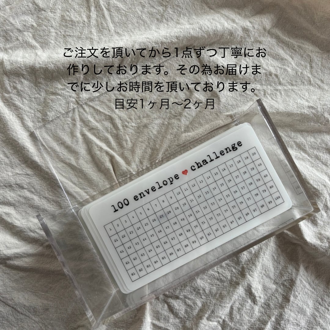 1~100までの番号が入ったポーチ式の封筒とチェック表をセットにしました。